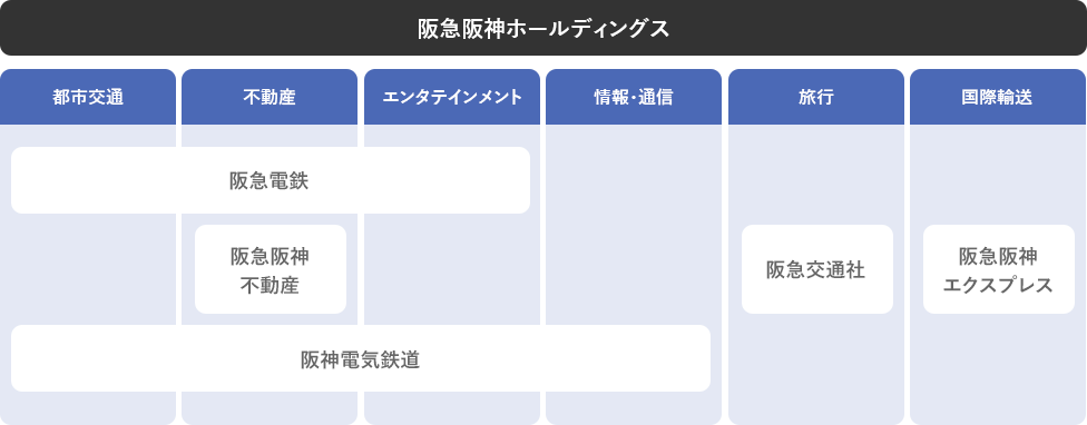 グループ経営機能を担う当社のもと、阪急電鉄、阪神電気鉄道、阪急阪神不動産、阪急交通社、阪急阪神エクスプレスの5社を中核各社として、グループ全体の有機的な成長を目指しています。