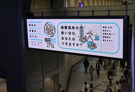 - 西日本旅客鉄道・グランフロント大阪TMO・Osaka Metroとともに、梅田エリアに来訪されるお客様やテナント従業員の方々などを対象とした防災啓発活動「梅田防災スクラム」を展開し、非常時の対応力向上(※)にまちぐるみで取り組んでいます。