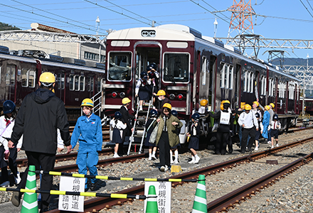 - お客様に安心して鉄道をご利用いただけるよう、安全を大切にする従業員の育成に取り組んでいます。具体的には、経営トップ層による現業部門の巡視及び従業員との意見交換を通じた安全意識の高揚、過去の事故や災害を学び、‶ 鉄道会社の従事員としてどう行動すべきか”を考えるための社員研修施設、安全考学室(阪急電鉄)・安全繫心室(阪神電気鉄道)の設置、鉄道施設の保守に関する技術向上のための安全大会の実施、非常事態の対応のための総合訓練の実施などを行っています。
