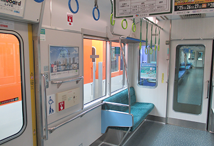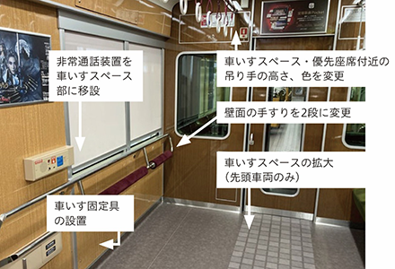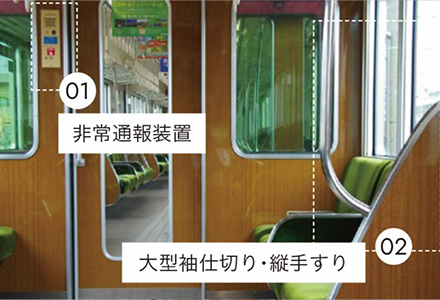 - 阪急電鉄では、車内で急病人や非常事態が発生した場合に、お客様から乗務員に通報できるよう、全車両に非常通報装置を設置しています。また、万が一の急ブレーキ時に、お客様の転倒や衝突を防止するため、1000系及び1300系以降の車両では座席端部の袖仕切りを大型に改良するとともに、縦手すりを設置しています。最も新しい形式の車両である2000系及び2300系においては、車いすスペースの拡大を図っており、車いす固定具を設置したり、車いすスペース・優先座席付近の吊り手の高さ、色を変更したりするなど、安全性向上に取り組んでいます。阪神電気鉄道では、乗務員と通話が可能な非常通報装置、車内案内表示器、車両連結間の転落を防止するほろを全車両に設置しています。また、普通車両の5700系及び5500系は、吊革の高さを3段階とすることや縦手すりを増やすことで、車両の揺れに対してお客様が適切に体を保持できるようにし、安全性向上に取り組んでいます。