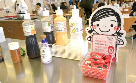 青色プレートの載った寄付付きメニューを喫食すると、1品につき10円を寄付できる。