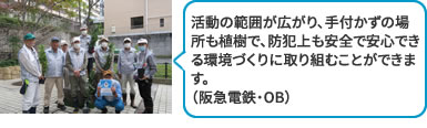 ルミナス箕面の森地区の植生環境を守るため除草・雑木の伐採や、生活環境の快適性確保ため周辺道路の清掃活動を行っています。