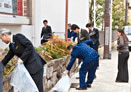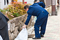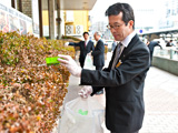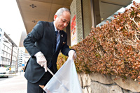 JR京都駅中央口の目の前、まさに京都の玄関口に佇む京都新阪急ホテル。月1回行われる清掃活動にお伺いすると、びしっとスーツを着こなした方も、作業着に身を包んだ方も一様に、手袋をはめ、火ばさみと「ゆめ・まちプロジェクト」のシンボルマーク付きゴミ袋を手にして、作業に取り掛かります。