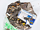 取材当日は2月末ということもあって、生垣の雑草も少なかったのですが、夏にはゴミ袋一杯になるほどの雑草を抜くこともあるそうです。また、ホテルの前は毎日清掃しているとあってきれいですが、排水溝を開け、お手製のザルで汚泥をすくうと、真黒な泥の中に目立って見えるのは、たくさんのたばこの吸い殻。この他にも生垣の中に、お茶のパックなどが捨てられていたりと、目につかないところにゴミはあるようです。