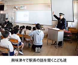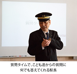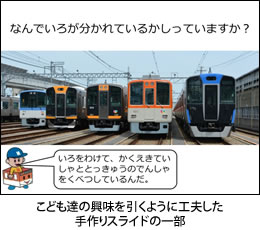 10月下旬のある日、梅香小学校に伺って、私達も2年生と一緒に出前授業を受けました。講師を務める阪神電気鉄道の鍵政駅長は、駅長帽をかぶってキリッとした制服姿で登場し、こども達のテンションも上がります。45分という限られた時間で、阪神電車の路線や駅のほか車両の色の区別、鉄道のさまざまな仕事について、スライドを使ってわかりやすく紹介していきます。その後、切符の買い方から改札口の通り方、プラットホームでの電車の待ち方などを説明し、最後は電車の乗車マナーについて伝えました。イラストに掲載された良いこと、悪いことを、みんなの前で発表する場面では、こども達は、すごい勢いで手をあげていました。身近な乗り物である阪神電車が、さらに近しい存在になればと思いました。