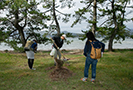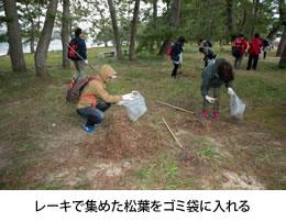 10月下旬の週末、貸切バスに乗って約2時間、天橋立に着きました。早速、清掃ボランティアの活動場所に移動し、土木事務所の方から活動の主旨や手順の説明を聞き、作業スタート。晴天に恵まれましたが、強風でゴミ袋が飛びそうになることもしばしば。そんな中、参加した従業員はレーキで松葉をかき集め、溜まったらゴミ袋に入れ、最後は回収用トラックへ運びます。