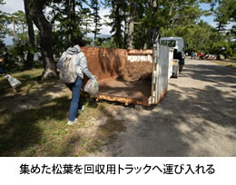 実は、私はゴミを拾うと思っていたので、松葉を集めると聞いてびっくり!松葉はたくさん落ちていて、ゴミを拾うのとは少し勝手が違いましたが、参加者21名が黙々と作業すること1時間半、いつの間にか、トラックには松葉がいっぱいになっていました。今回で2回目の参加という方は「気軽にボランティアできるきっかけとしていいですね。職場が離れた同僚とも会えるので、誘い合って参加しました」と話していました。